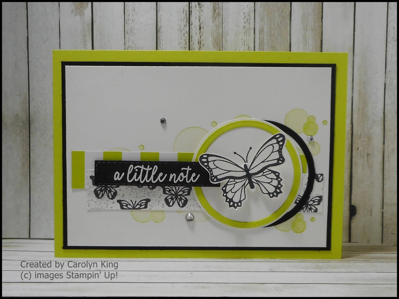 The sentiment and the butterfly are from the Butterfly Gala stamp set. Lucky that this sketch is a great one for a quick card, a few strips of patterned paper, a few circles, a bit of stamping and heat embossing you have a finished card.