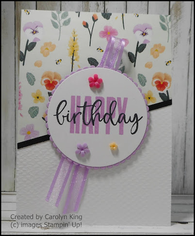 This piece of patterned paper was cut at 10.5cm wide by 6cm high. Three strips of Basic Black cardstock were added below the patterned paper behind the sentiment circle.